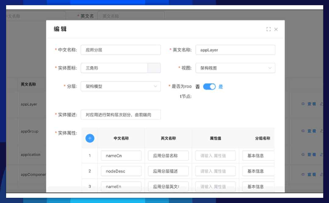 同时,平台采用知识图谱的方式对架构元模型进行存储。基于知识图谱弹性框架,可自定义维护资产种类、属性和关系,方便架构资产的动态扩展,帮助企业构建架构资产知识体系。